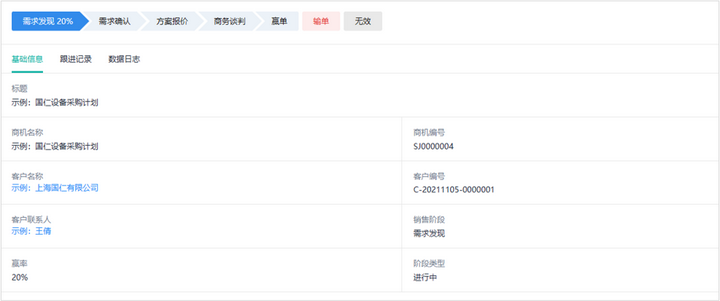② 商機跟進:商機階段可以分為需求發現、方案報價、贏單等多個階段,銷售可根據跟進情況更新狀態。
