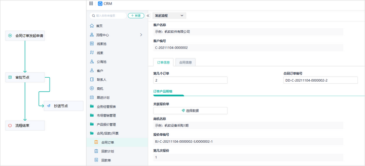 確定(ding)贏單后,銷售可通(tong)過CRM客戶關(guan)系管理系統在線發起(qi)合同訂單、回款計劃、開票申請等流(liu)程,以(yi)上相(xiang)關(guan)商務流(liu)程可以(yi)根據企業(ye)自(zi)身需求進行自(zi)定(ding)義。